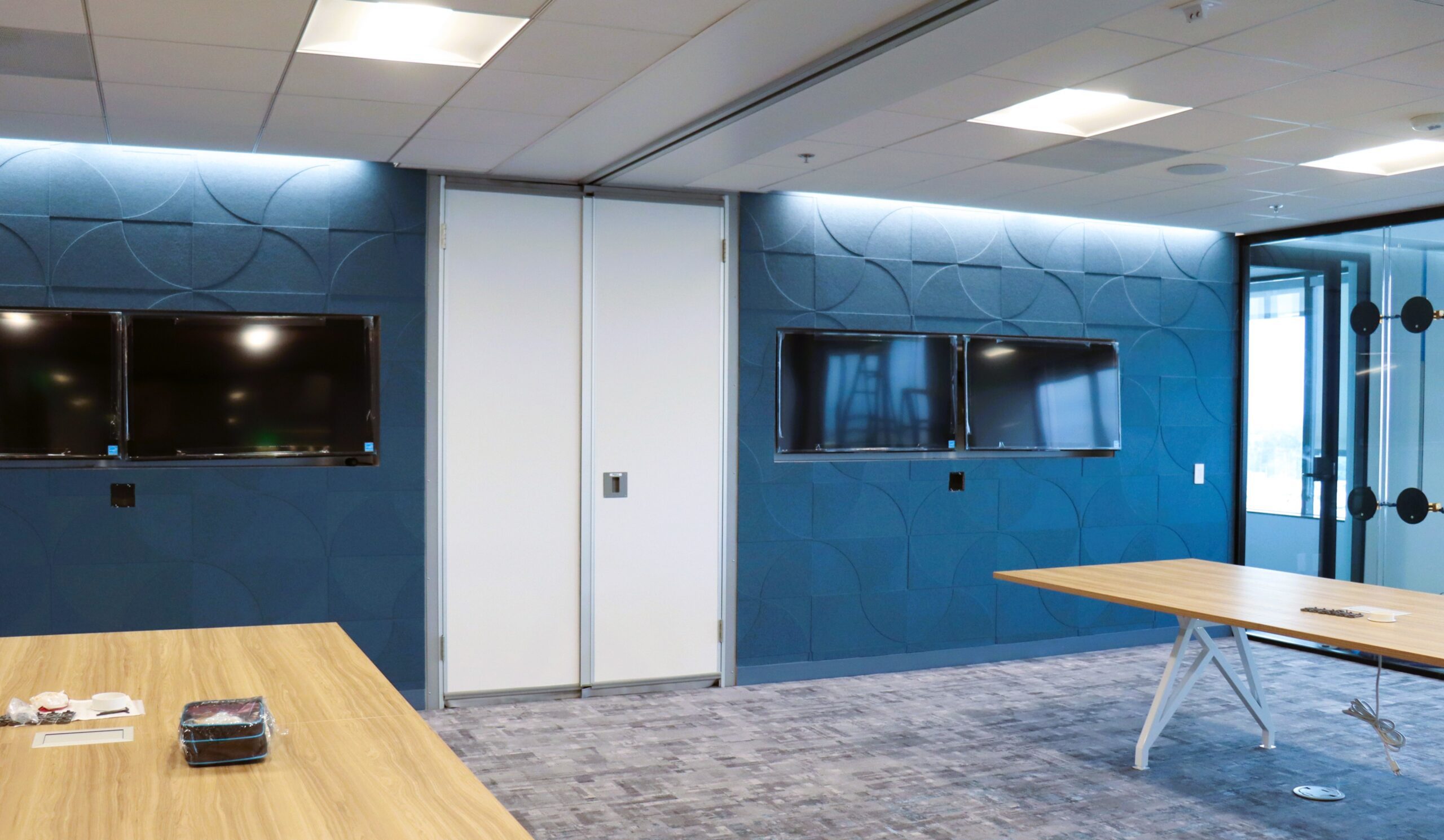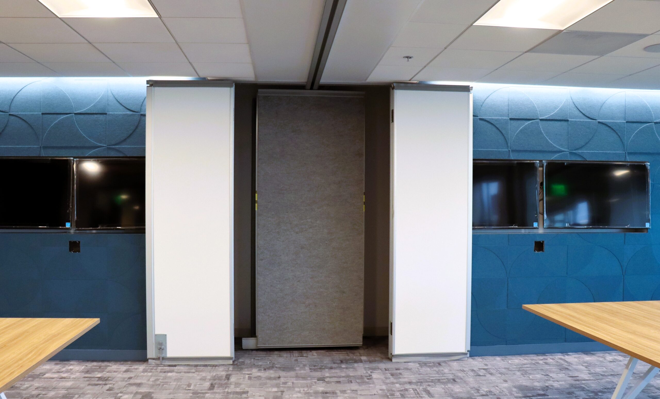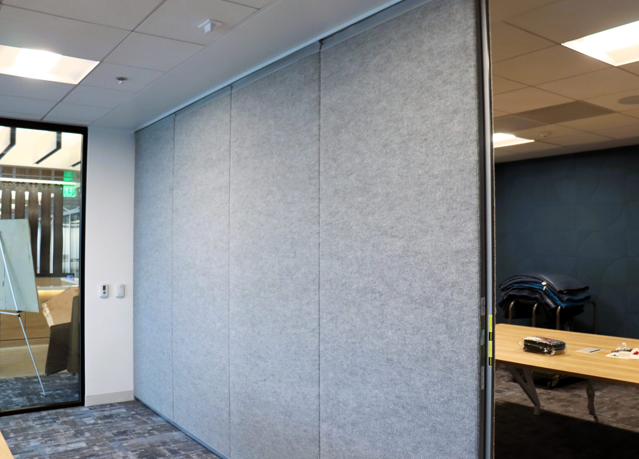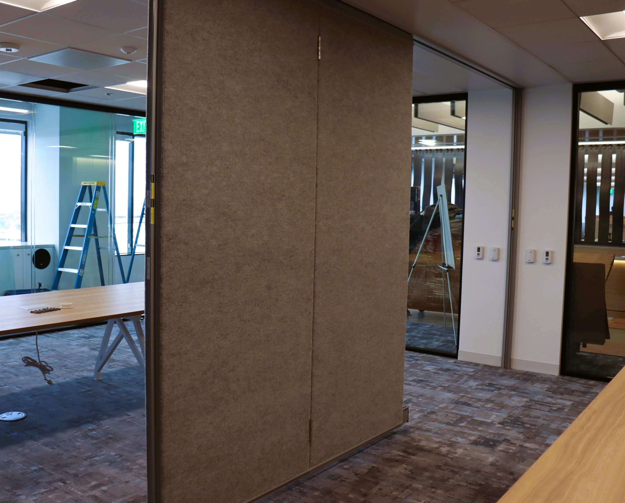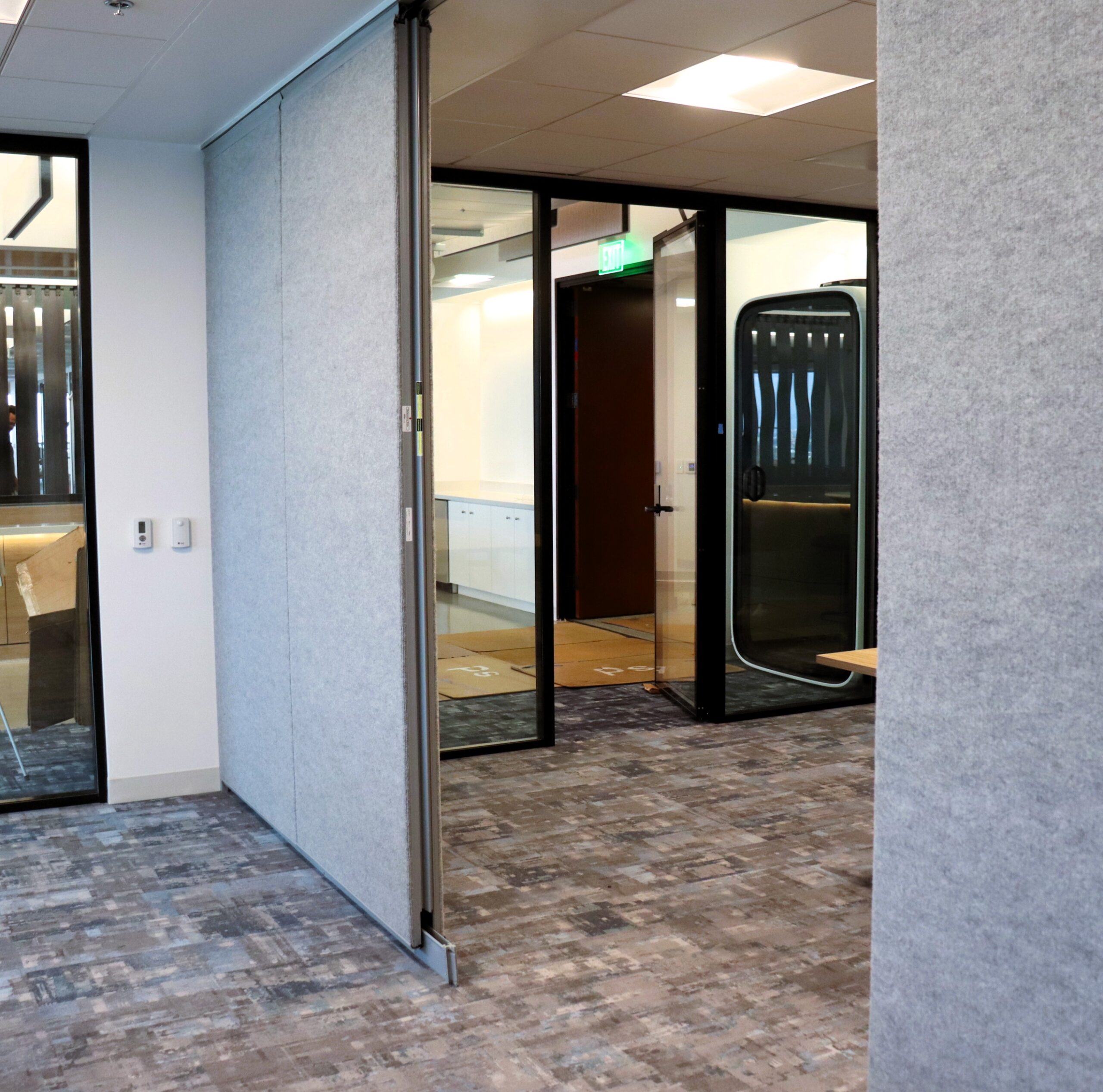 At Degenkolb, our team is maximizing acoustic performance with this innovative paired panel partition, boasting an impressive 52 STC rating for superior sound isolation. We've paired it with a stylish carpet finish enhanced by high NRC values to absorb echoes and minimize reflective acoustics—creating a quieter, more comfortable space.