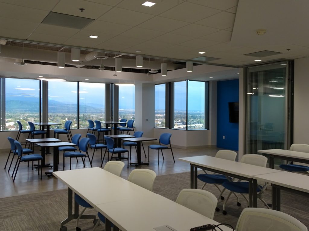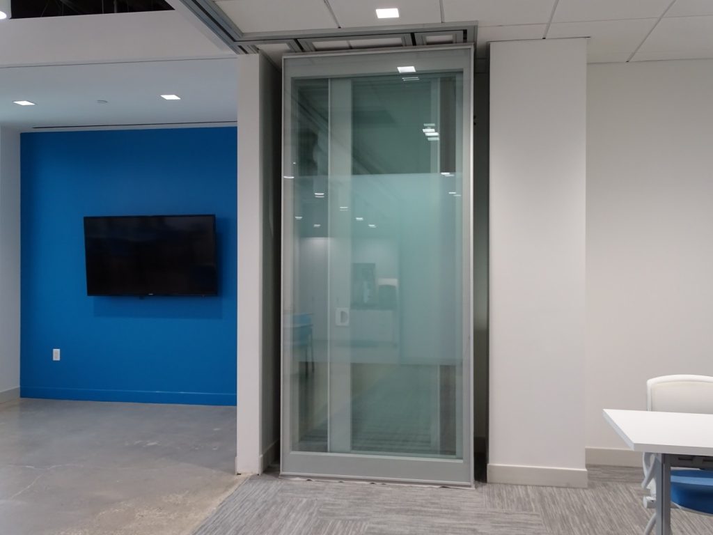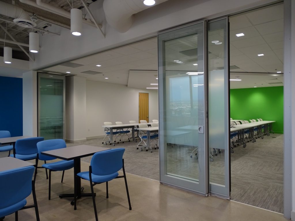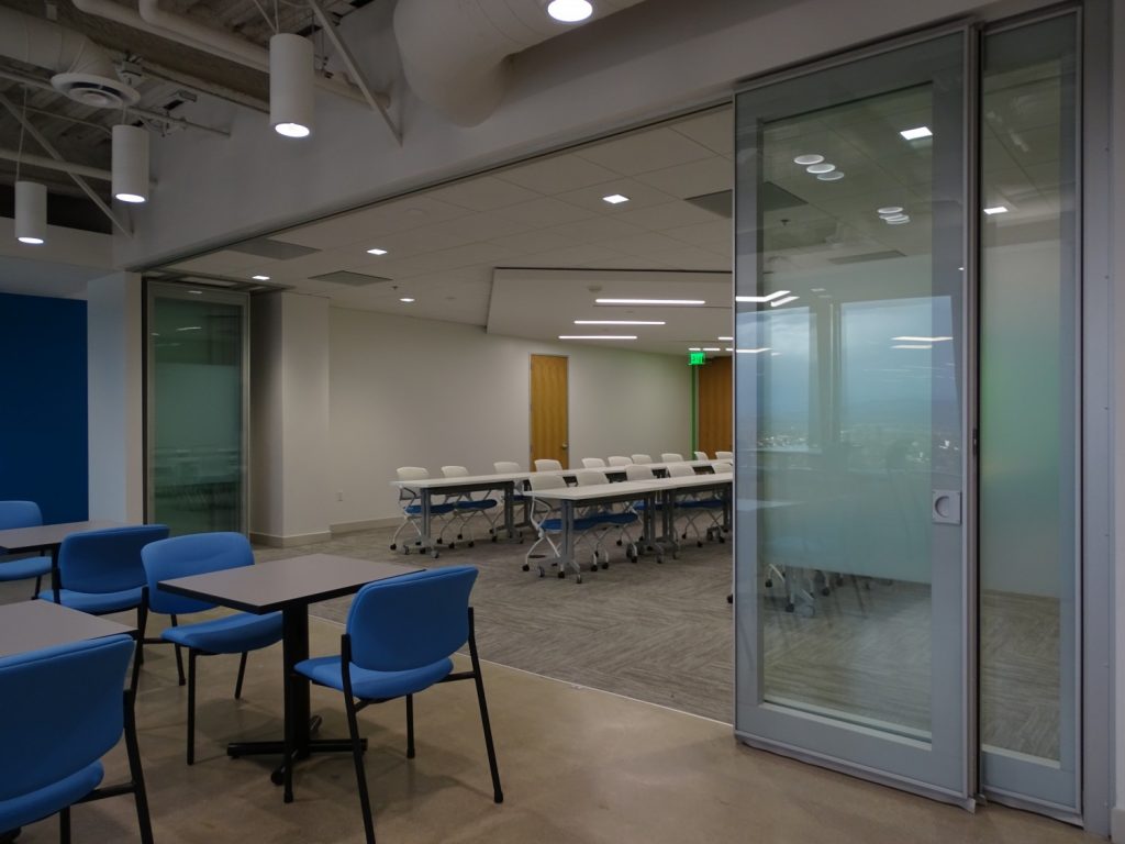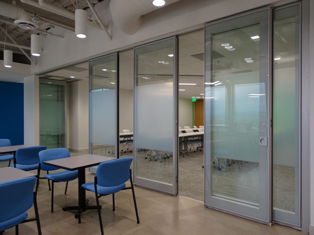Another great flexible and creative space project with Moderco’s Crystal 44 STC glass operable partitions. SAA Interior Architects designed a beautiful spaces for the corporate offices of WKE, Inc. These civil engineers will notice and appreciate the quality details. The glass preserves the views with a daily pass door when set up. When needed, within minutes the partitions pocket away to create wide open spaces. Crew Builders brought the project together well as GC. PMRG manages this great property at the 22 and 5 freeways.